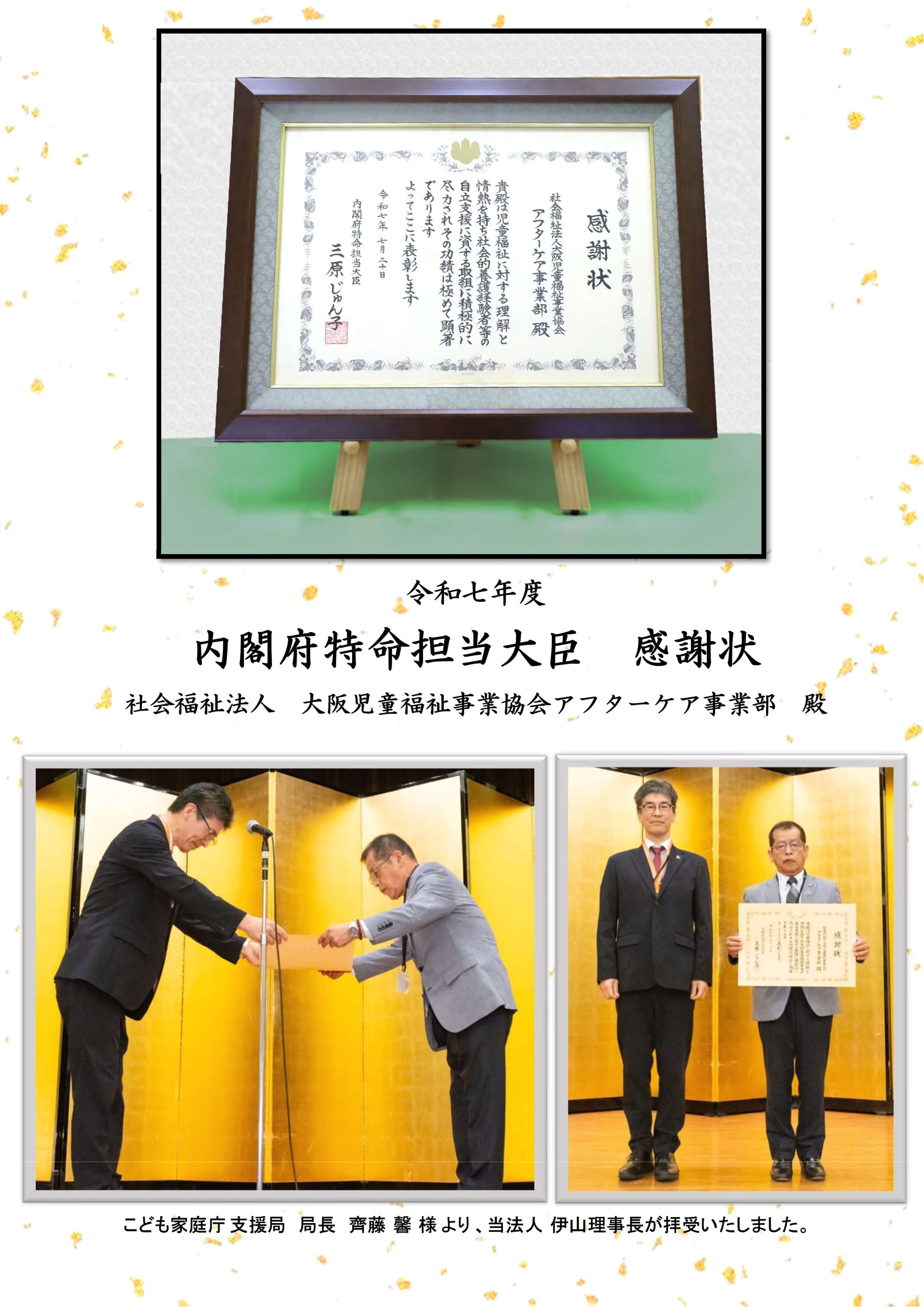 当アフターケア事業部が25年に渡って取り組んでまいりました「ソーシャル・スキル・トレーニング」について、内閣府特命担当大臣 三原 じゅん子様からその功績が称えられ、令和7年7月20日(日)にシェラトン都ホテル大阪にて、「内閣府特命担当大臣感謝状」を拝受いたしました。