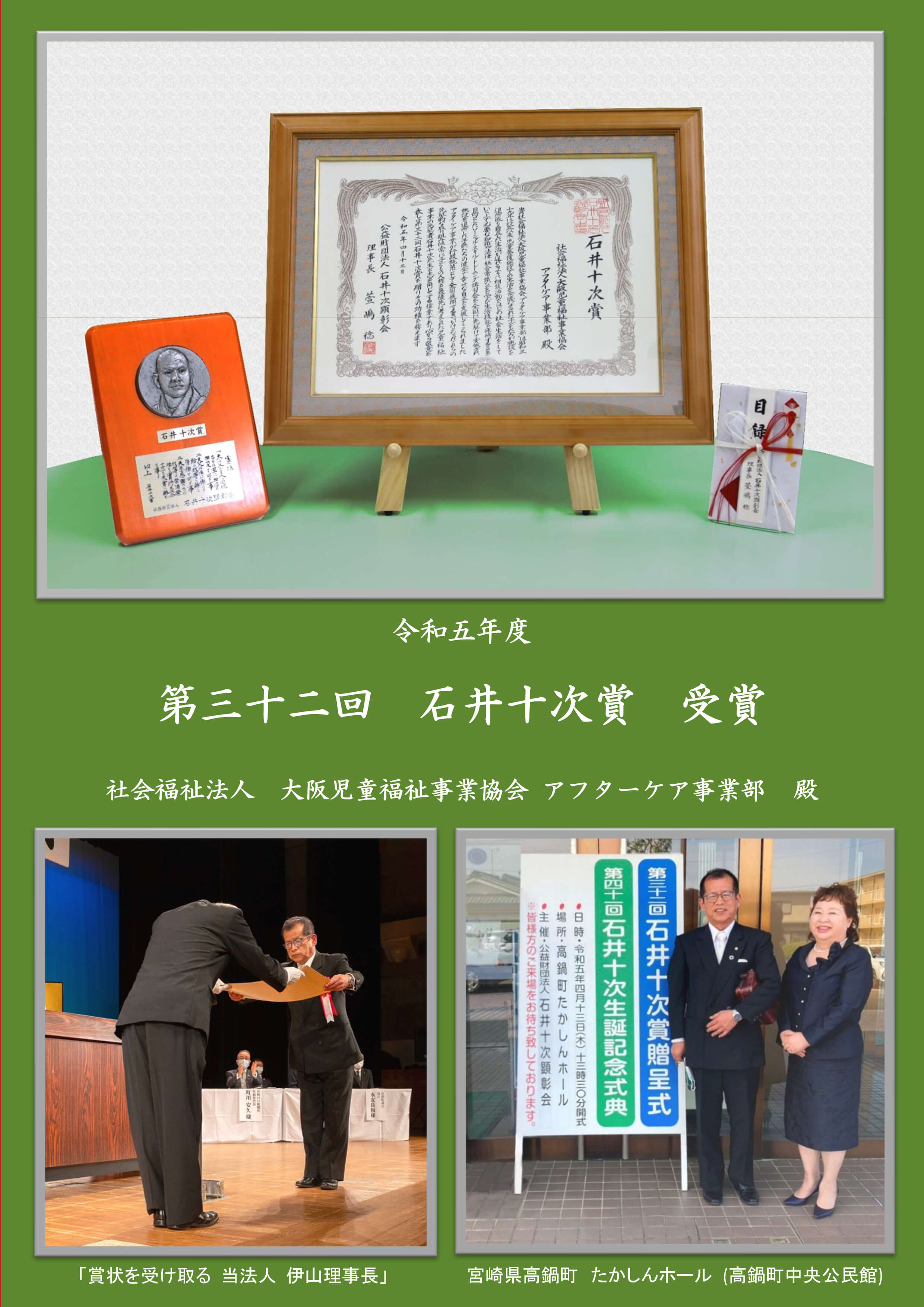 令和5年4月13日(木)『第32回石井十次賞』授賞式が宮崎県高鍋町 たかしんホール (高鍋町中央公民館)にてとり行われ、公益財団法人 石井十次顕彰会 様より表彰状と記念盾を拝受しました。